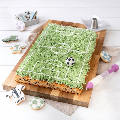 Nous avons exactement ce qu'il faut pour tous les amateurs de football : avec l'ensemble de décoration de terrain de jeu de 6 pièces, il vous sera très facile de réaliser un gâteau d'anniversaire pour les fans de football, des cupcakes pour le match que vous allez regarder ou l'encas parfait pour soutenir votre équipe préférée. La douille de pâtisserie en acier inoxydable fait sortir la préparation en un motif d'herbe afin de reproduire celle du terrain de football, tandis que le stylo décoratif dessine les lignes fines du terrain de jeu en blanc. Les 4 poches à douille en plastique vous permettent de réaliser la décoration du gâteau ou des cupcakes avec précision.