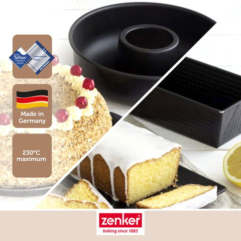 Zenker vous propose ce set de 2 moules à gâteaux composé d'un moule à cake noir mesurant 30,5 x 11,5 cm et permettant de cuire de magnifiques cakes salés et sucrés, ainsi que d'un moule à savarin avec un fond lisse de 28 cm de diamètre. Ce moule à gâteau est un ustensile de pâtisserie idéal pour cuire un gâteau au citron, au chocolat, au yaourt, mais aussi des savarins et des brioches. Préparez également de bons cakes au citron ou aux lardons grâce au moule à cakes.