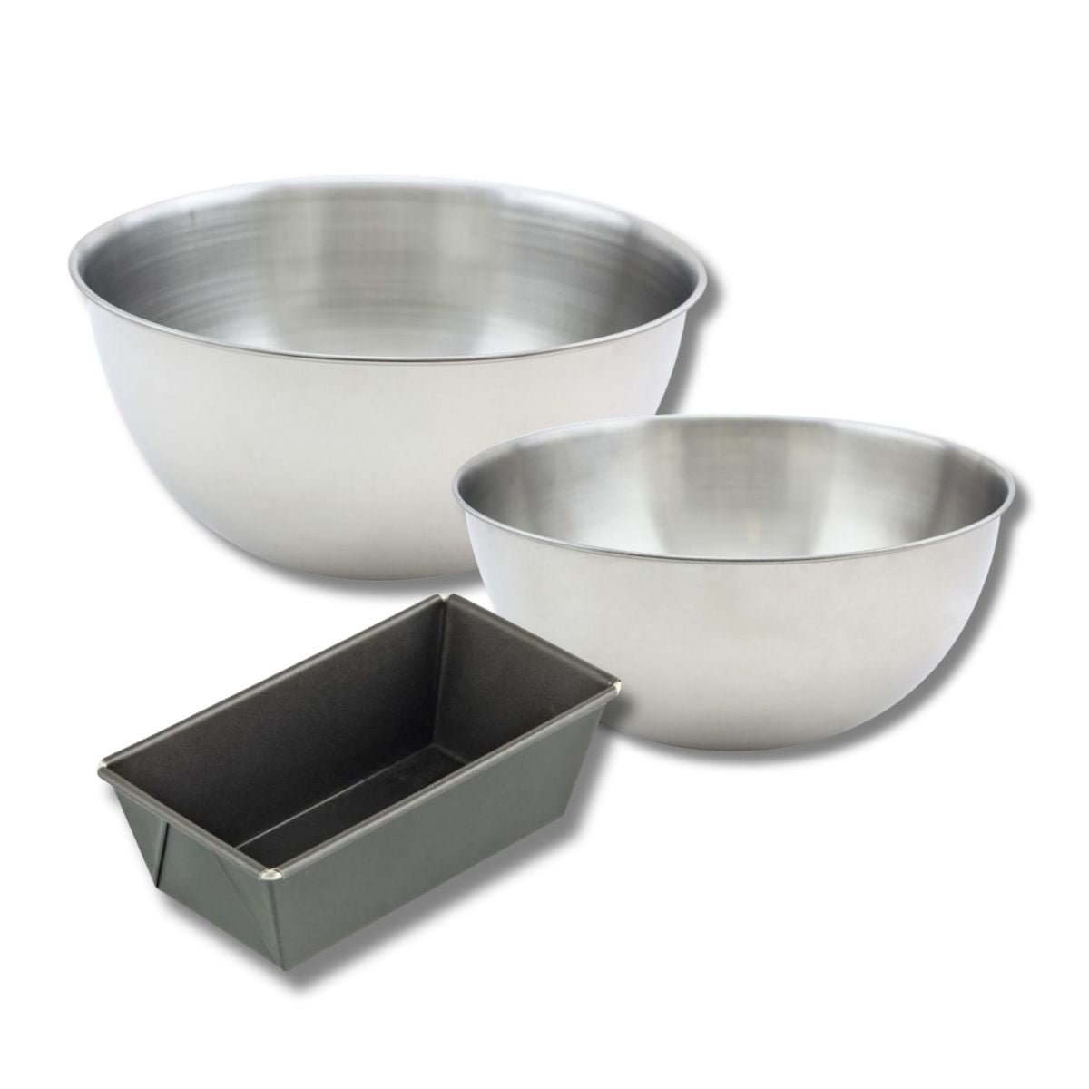 Découvrez ce set à pâtisserie Zenker comprenant 4 ustensiles : un mini moule à cake 20 cm, deux bols à mixer en inox de 25 cm et 20,5 cm, ainsi qu'une spatule de cuisine de 25 cm. Parfait pour réaliser vos mini-cakes, pains ou brioches !