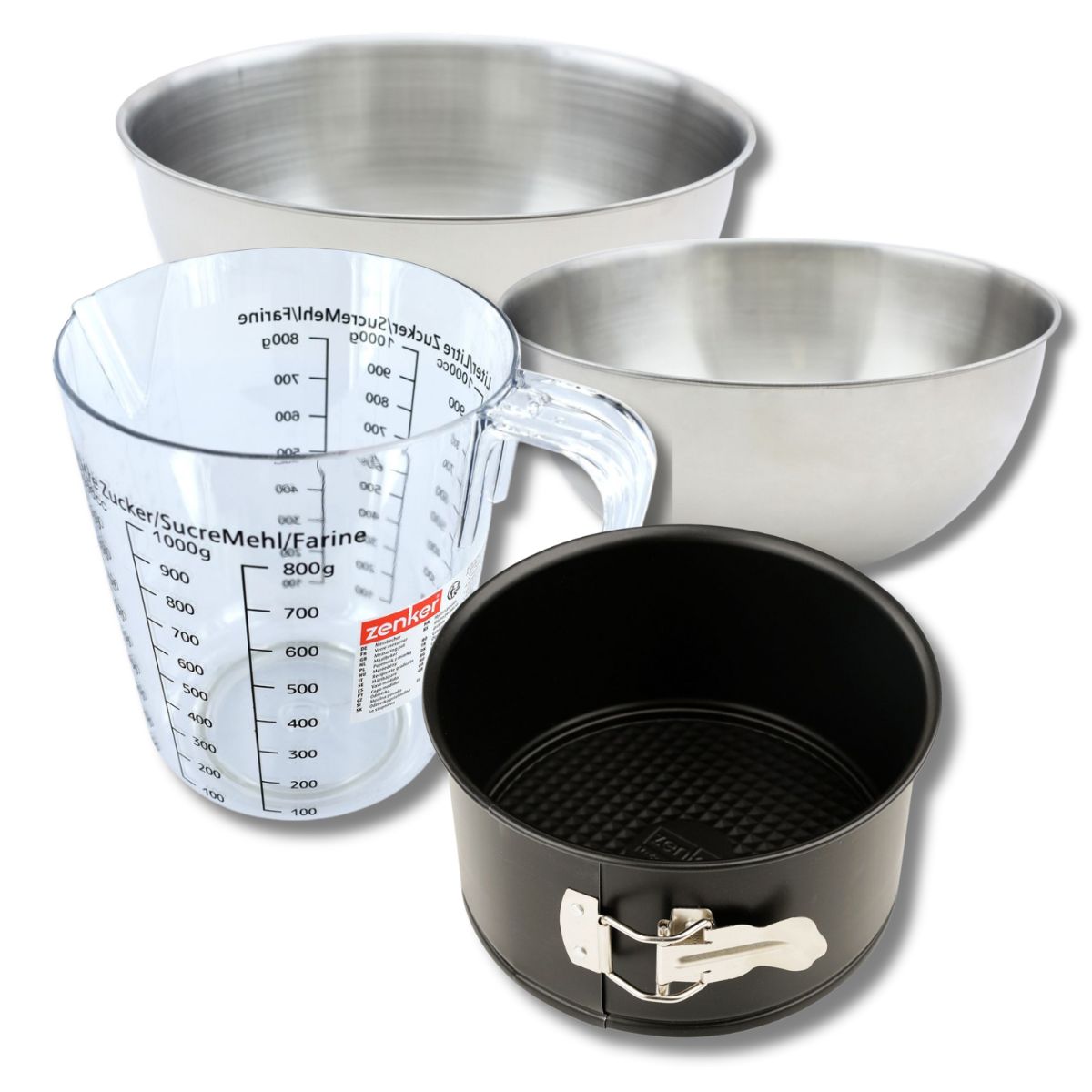 Les deux bols à mixer en inox (25 cm et 20,5 cm) sont parfaits pour préparer toutes vos pâtes et mélanges. La spatule en silicone de 25 cm Zenker vous permet de racler efficacement vos préparations, tandis que le verre doseur de 1L vous assure des mesures précises.