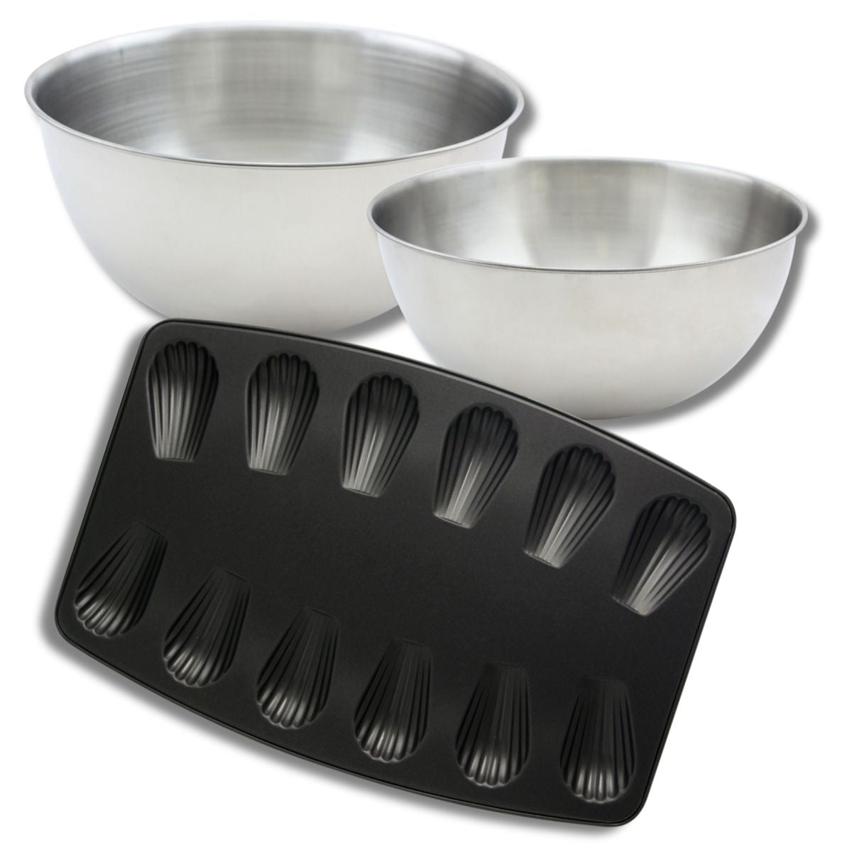 Découvrez ce set à pâtisserie Zenker comprenant 4 ustensiles : un moule à 12 madeleines , deux bols à mixer en inox de 25 cm et 20,5 cm, ainsi qu'une spatule de cuisine de 25 cm. Parfait pour imaginer vos douceurs, des madeleines classiques aux recettes salées qui renouvellent ce plaisir !