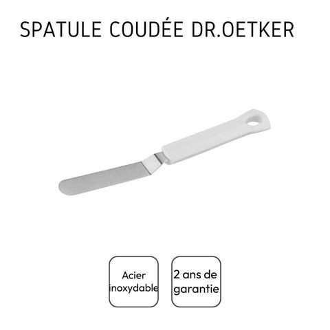 Dr.Oetker propose cette spatule coudée en inox de 23 cm de long au total. C'est l'accessoire de pâtisserie adéquat pour étaler le glaçage sur votre gâteau.