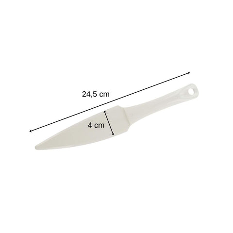 Cet ustensiles de pâtisserie est une spatule blanche en plastique permettant d'étaler un glaçage sur une pâtisserie ou un gâteau, de décoller les bords du gâteau de la paroi du moule à gâteaux, de mélanger ou racler une préparation dans un bol, ou encore de servir une part de tarte ou de gâteau. Cette spatule de pâtisserie peut également servir de couteau pour gâteaux et tartes grâce à son bout pointu.