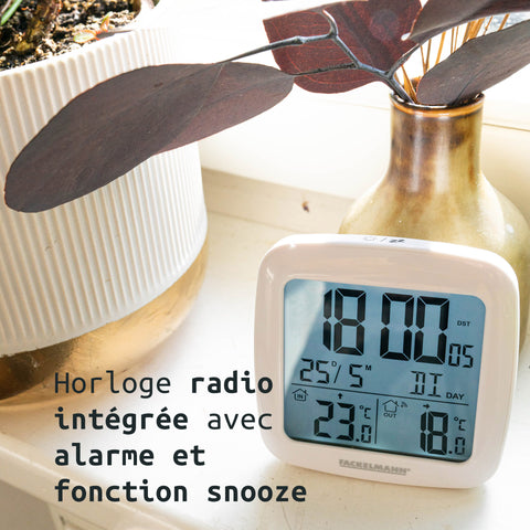 Le thermomètre radio numérique intérieur / extérieur de haute qualité de Fackelmann de la série Tecno avec horloge radio fournit des informations fiables sur la situation météo actuelle, le capteur intérieur mesure la température entre 0°C et 50°C et celui de l'extérieur entre -40°C et 70°C. Le radio-réveil affiche toujours l'heure et la date correctes. Il mesure la température intérieure, la température extérieure est transmise sans fil via un capteur placé à l'endroit de votre choix, sa portée est de 60 mètres environ.