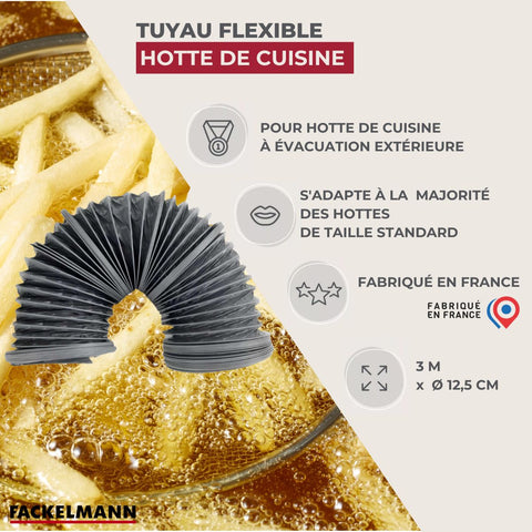 Optimisez l'efficacité de votre hotte de cuisine avec notre tuyau d'évacuation de 3 m de longueur et 12,5cm de diamètre. Conçu pour s'adapter à la majorité des hottes aspirantes de taille standard, ce tuyau flexible se plie à volonté pour s'ajuster parfaitement à votre environnement d'installation. Nous vous recommandons cependant de vérifier les dimensions avant de commander. Sa composition en plastique avec armatures métalliques garantit sa robustesse et son adaptabilité. Facile à installer, il contribue à l'évacuation efficace des graisses générées par la cuisson et la friture, vous offrant ainsi un espace de cuisine sain et propre.