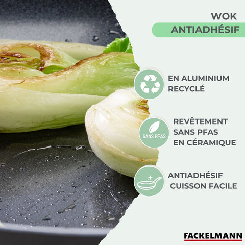 Le Wok Fackelmann de 28 cm en aluminium pressé recyclé avec revêtement céramique sans PFAS offre une cuisson parfaite et un nettoyage facile. Compatible tous feux, y compris induction, et résistant au four jusqu'à 150°C.